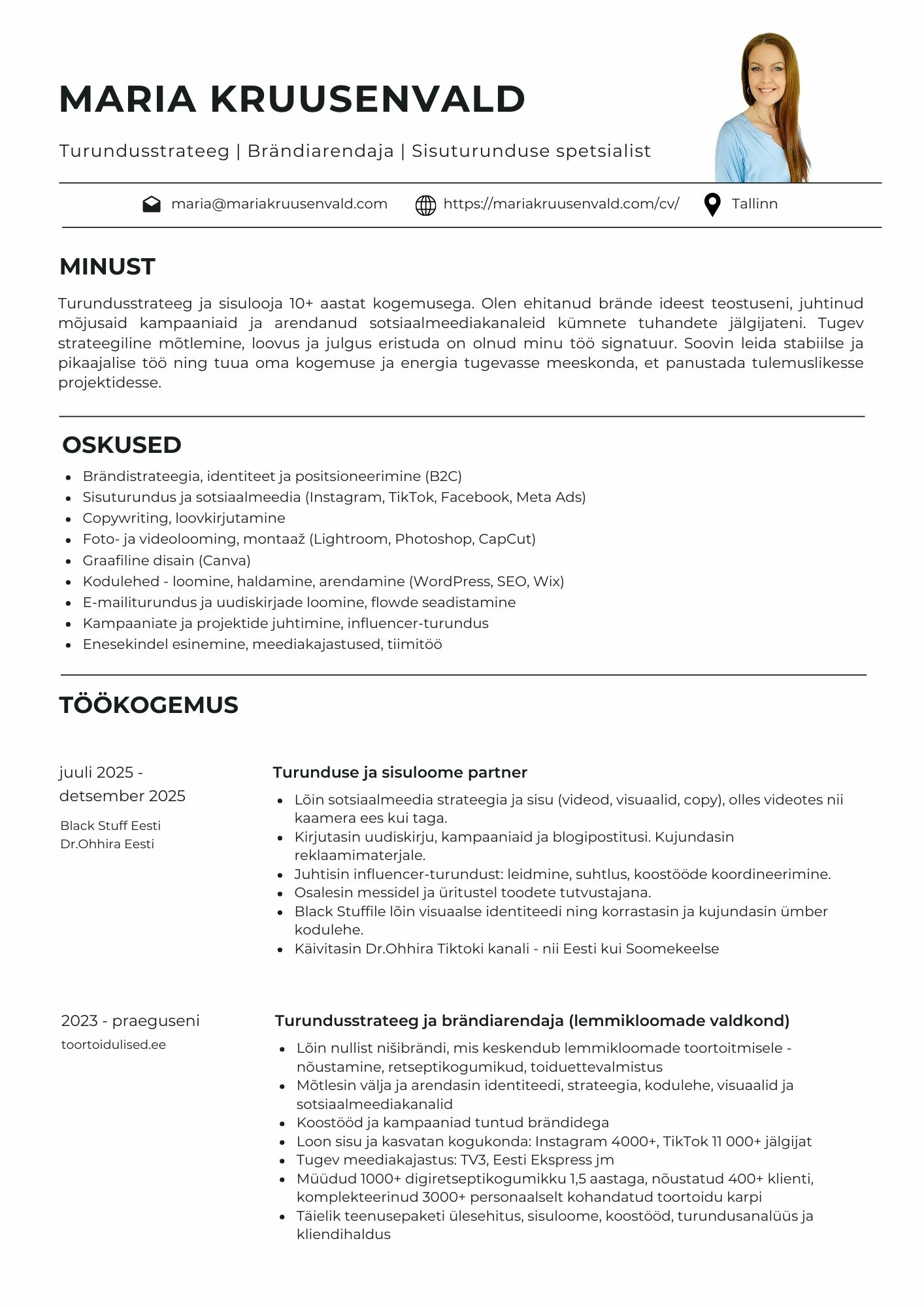 Olen tulemusele orienteeritud turundaja ja sisulooja, kellel on üle 10 aasta kogemust brändide ehitamisel ja lugude rääkimisel, mis kõnetavad ja ühendavad inimesi. Minu tugevusteks on strateegiline mõtlemine, loovus ja oskus näha tervikpilti ka kõige kiiremas tempos. Mulle meeldib teha asju originaalselt ja eristuda, et saavutada tulemusi, mis jäävad meelde. Olen iseseisvalt, ilma eelarveta, ellu viinud turundusprojekte sellisel tasemel, mille jaoks ettevõtted palkavad tavaliselt suure meeskonnaga reklaamiagentuuri.