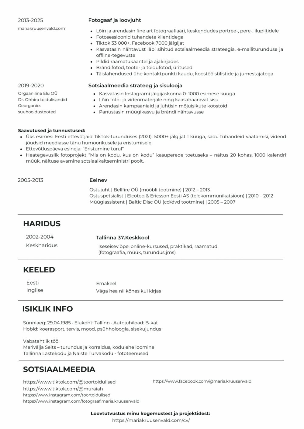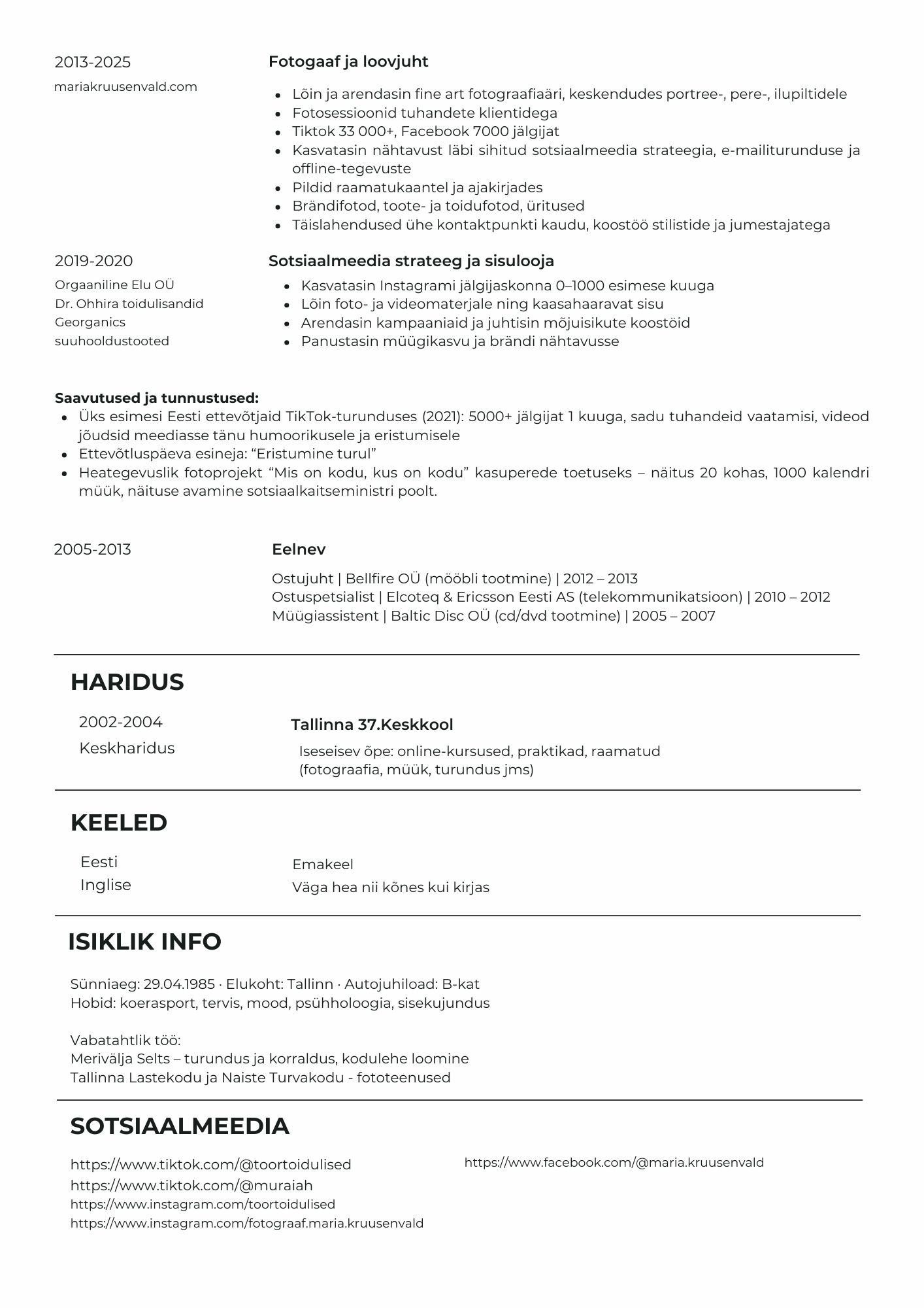 Kasvatan kanaleid järjepideva, strateegilise sisuloomega – TikTok, Instagram, Facebook. Tean, mis töötab algoritmides ja inimestes.